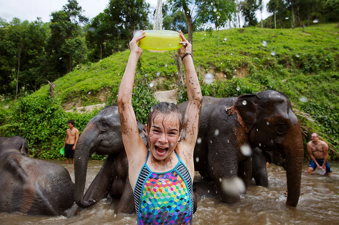 So, I knew that we had a mud bath with them and, in theory, this sounded like so much fun. In action, as we stood there listening to the instructions from our guides…well, the elephants(who were already standing in the mud) took multiple giant poops. And, their poops were literally the size of a basketball(or bigger)…and our Thai guides kept picking them up(or catching them) and then tossing them over their shoulders I suppose to ‘remove’ them from the mud pile. As a mama, this had me somewhat concerned so I literally yelled at my kids as they ran into the mudbath ‘DO NOT TOUCH YOUR HANDS TO YOUR FACE OR YOUR EYES!!! KEEP YOUR MOUTH CLOSED!!’ Honestly, it doesn’t take long to just get over the poop/mud and enjoy yourself—even for me. That night we did have long, HOT showers as a precaution(I should mention that no one did get sick).