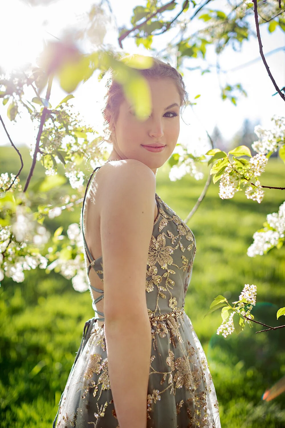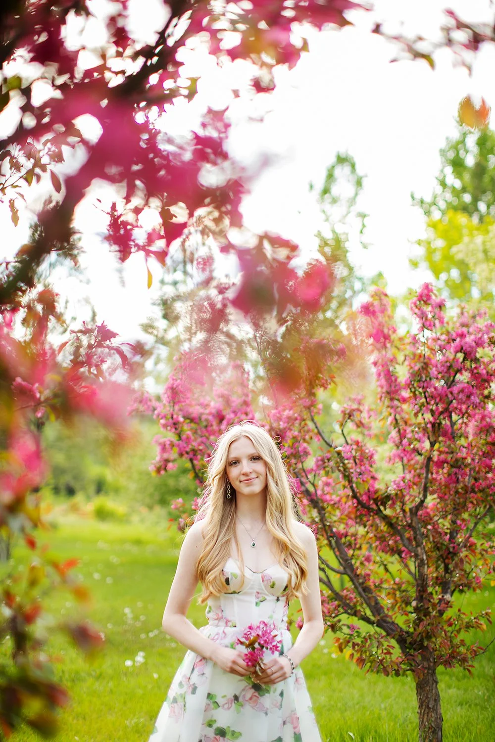 Calgary Graduation Photographer, Dana Pugh, photographs a recent Okotoks graduate in the spring blossoms